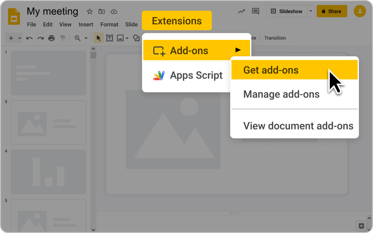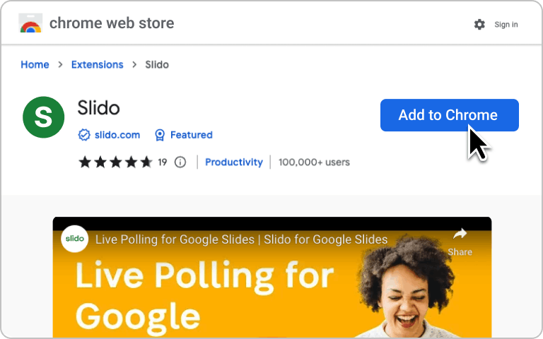 Make your presentations more interactive with Slido’s intuitive Google Slides add-on.