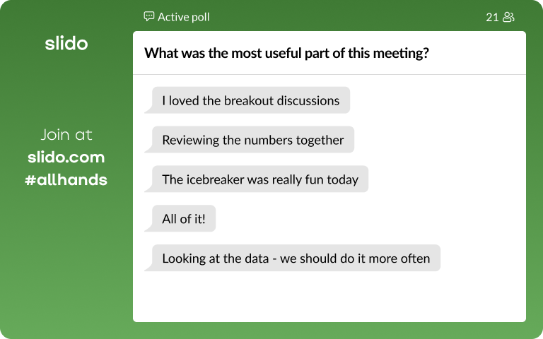 Check out our presentation template for polling examples and tips on using the Slido integration in Google Slides.